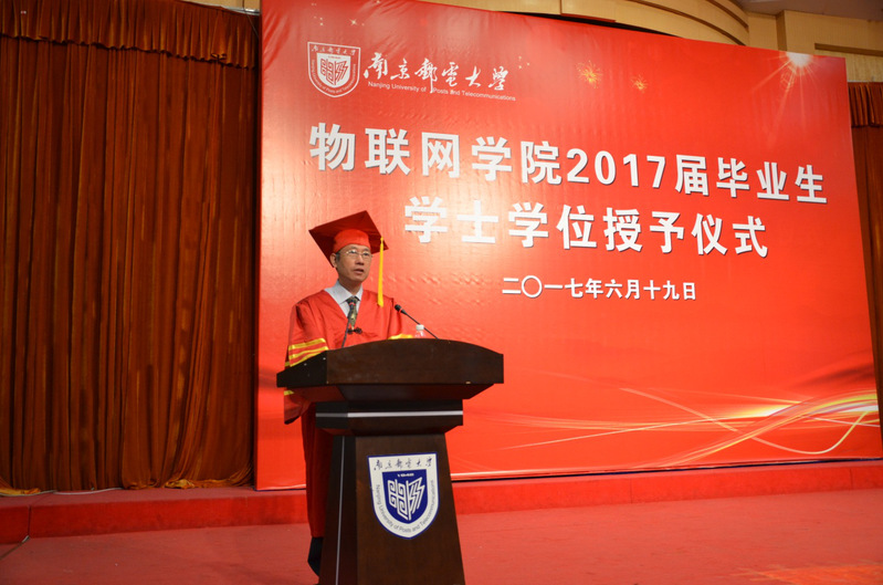2017年6月19日上午,yl88858cc2017届本科生学士学位授予仪式在三牌楼校区科学会堂二楼报告厅隆重举行。出席仪式的有yl88858cc党委常委,副校长李建宇教授、yl88858cc院长张登银教授、yl88858cc党总支书记周健副教授、yl88858cc副院长魏建香副教授、yl88858cc副院长潘甦教授、yl88858cc院长助理王堃副教授、物联网工程系主任陈思光副教授、全体毕业生,以及部分参加观礼的毕业生家长。仪式由院党总支副书记李承晟主持。