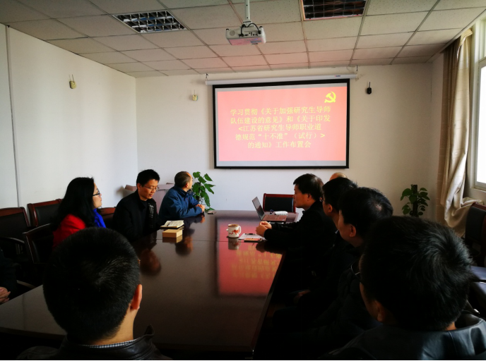 2018年11月19日,yl88858cc组织教工一支部、二支部教师党员和研究生导师集中学习了《江苏省研究生导师职业道德规范“十不准”(试行)》(简称《十不准》)以及《关于加强研究生导师队伍建设的意见》(简称《意见》)。学院要求全院研究生导师要认真学习、贯彻落实文件精神,坚持师德为先、育人为本、质量为要的基本要求,全面落实研究生导师是研究生培养第一责任人的要求,明确研究生导师的主要职责,促进yl88858cc研究生导师队伍师德师风建设工作的深入开展。