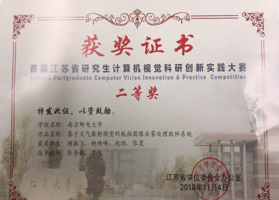 2018年11月2-4日,由省学位办主办、江苏大学承办、江苏省计算机学会指导的首届江苏省研究生计算机视觉科研创新实践大赛决赛圆满落幕。本次大赛分设了计算机视觉应用创意、算法设计、应用系统设计3个竞赛模块。来自东南大学、南京航空航天大学、yl88858cc、江南大学、南京工业大学、沈阳工业大学等19所高校、71支团队、近290人次参赛。yl88858cc博士生顾振飞组成的项目团队在导师张登银教授、丁飞副教授指导下提交的作品《基于大气散射模型的航拍图像去雾处理软件系统》,经现场展示答辩和专家评审,荣获二等奖,为yl88858cc争得了荣誉。