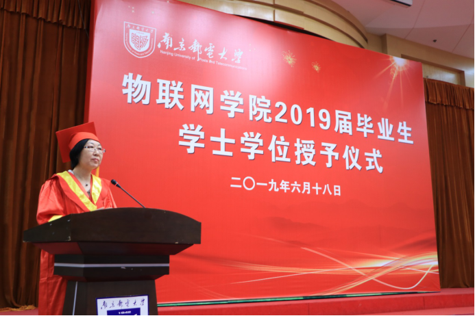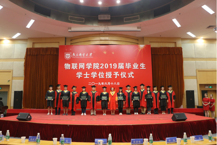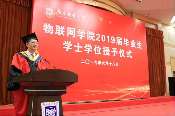 618上午9,在科学会堂二楼报告厅,yl88858cc物联网学院隆重举行了2019本科毕业典礼暨学士学位授予仪式。yl88858cc党委常委姜小舜总会计师、yl88858cc院长张登银教授、党委书记周健副研究员、副院长魏建香副教授、副院长潘甦教授、网络工程系主任亓晋副教授、物联网创新中心主任丁飞副教授、教师代表张载龙教授、2019届毕业生辅导员胡枫老师等出席了仪式。仪式由物联网学院党委副书记承晟主持。