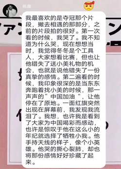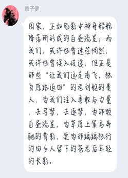 很多同学针对自己感触最深的片段谈了自己的所思所想。有同学被“前夜”中“一方有难,八方支援”的精神所感动,国旗成功升起的那一刻自豪感油然而生;有同学从“北京你好”中“大事件下的小人物”联想到新冠肺炎,从而感叹“祖国是每个中华儿女在苦难中的灯塔”;也有很多同学喜欢“夺冠”,富有生活气息的场景让人更有代入感,更能切身感受到女排精神的激励......我们喜爱一部影片的原因,无非有两类,一是影片中的故事来源于我们的日常,使我们平时生活的映射,所以喜爱;另一类大概就是从影片中,折射出另外的内容,引发我们对自己、对社会的思考。而从这部影片中,同学们感受到了祖国及祖国儿女拥有着一股强大的力量,这股力量始终推动着中国克服种种困难,步步向前。当前,中华民族又面临着一大考验,我们相信这股力量也会推动着我们前行,在这场没有硝烟的战争中,胜利仍然属于英雄的中华儿女!