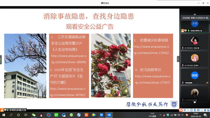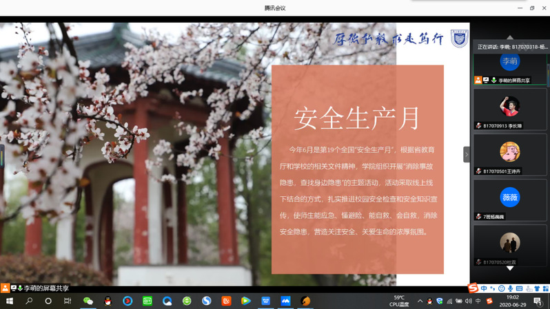 安全工作始终是校园各项工作中的重中之重,为进一步落实好安全生产月相关文件精神、提升学生的安全意识,6月29日,yl88858cc通过腾讯会议开展安全生产月主题活动,活动由2017级辅导员李萌老师主持,2017级全体学生参加活动。