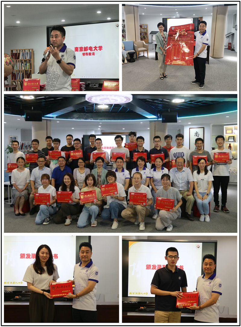 仪式上,张校长向两校领导赠送了喜报,将录取通知书亲手交予每一位新生手中,并与新生一一合影,与他们共同分享金榜题名的喜悦。两校的新生代表在发言中表示今天颁发录取通知书仪式将会成为自己人生中最珍贵的回忆,他们都怀着对高中学习的美好回忆,带着对大学生活的美好憧憬,表达了对高中母校老师精心培养和对南邮校领导悉心关怀的诚挚谢意,立志将更加珍惜大学时光,早日实现角色转变,不断砥砺前行。录取通知书颁发仪式结束后,与会领导老师与新生合影留念。