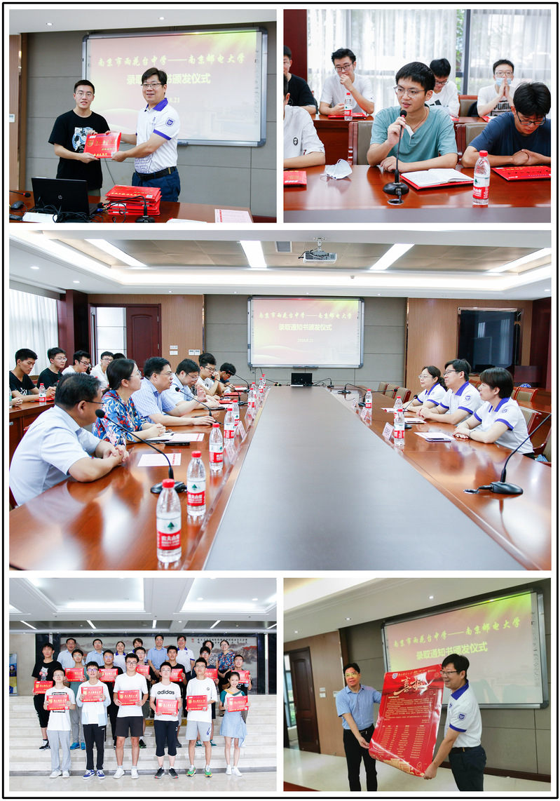 在两校举行的录取通知书颁发仪式上,张恒柱校长、林啟红校长介绍了南京市第十三中学、南京市第九中学的学校历史、办学理念和教育教学成果,他们对考取南邮的优秀学子表示祝贺,对南邮近年来的快速发展表示赞赏,表达了未来与南邮在人才培养方面加强合作的意愿,同时,都寄语学子们要心怀感恩,奋发向上,回报母校。