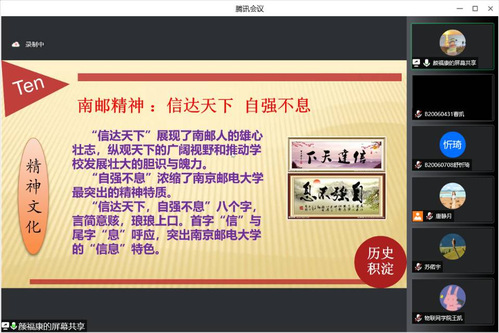 “伟大的战邮精神,永远激励着一代又一代的邮电人不畏艰难、无私奉献、团结拼搏、勇往直前。”课程伊始,颜老师首先向同学们讲述了战邮干训班的成立背景,从四月始源、红色印记、史久源悠、援手同门、育英三叠、一脉根深、邮电情结、师者如兰、柚子风采、飞鸿奋翅等十个方面全面回顾了南邮的办学历程和取得的辉煌成就。