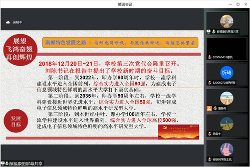 课上,颜老师还对南邮的红色基因传承、学科水平攀升、综合实力提升及学子们的未来发展作出了憧憬、鼓励和期许。他强调,学校正抢抓机遇,全面贯彻落实习近平新时代中国特色社会主义思想,坚持“质量立校、人才强校、特色兴校、创新活校”四大战略,牢固确立“调结构,促转型;补短板,上水平;强特色,创一流”的战略思想,推动电子信息科学与工程学科群整体实力进入世界一流学科行列,全面开启研究型大学建设新征程,努力建成电子信息领域特色鲜明的高水平大学。相信学校的发展将空前迅速,学子们的未来也必将会有无限可能!