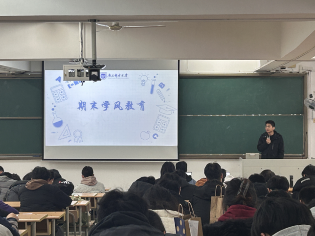 会议伊始,于老师回顾了本学期的主要工作,并对学生们的认真学习以及取得的成绩给予了肯定。其次,面向年级学生开展了辅导员、班主任面对面测评工作。随后,于老师面向全体同学开展了劳模工匠精神教育,并对工匠精神进行了阐释,希望同学们能学习优秀校友的事迹,追求上进。接着,于老师强调了诚信在学术和生活中的重要性,并提醒同学们注意假期安全,包括交通、网络和个人财产安全等方面。心理健康教育及宿舍管理方面,老师指导我们要保持良好心理状态和宿舍环境,鼓励同学们在遇到困扰时寻求帮助,并维护和谐的宿舍关系。最后,于老师重点强调了期末阶段的复习工作,他鼓励同学们积极备考,营造良好的个人学风、宿舍学风、班级学风以及年级学风。