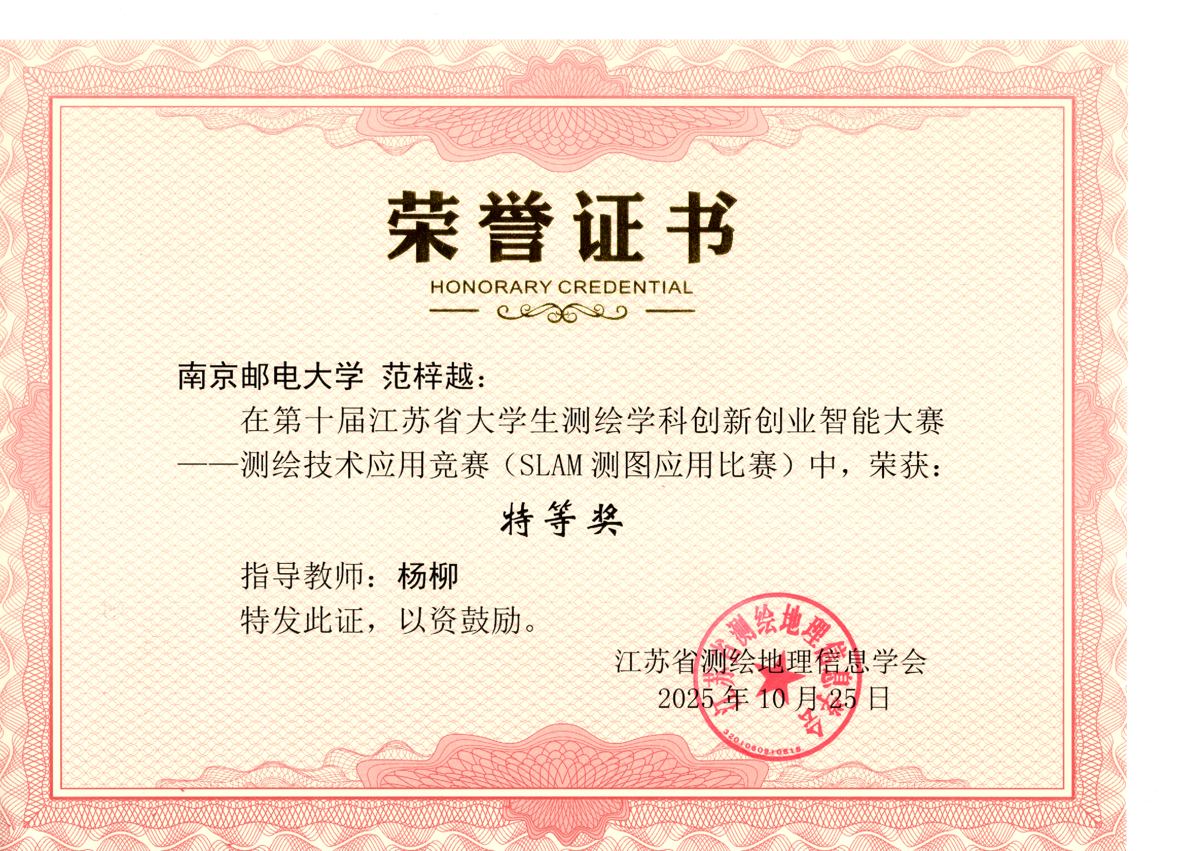 测绘技术应用竞赛(SLAM测图应用比赛) | 范梓越 | 杨柳 | 特等奖 |