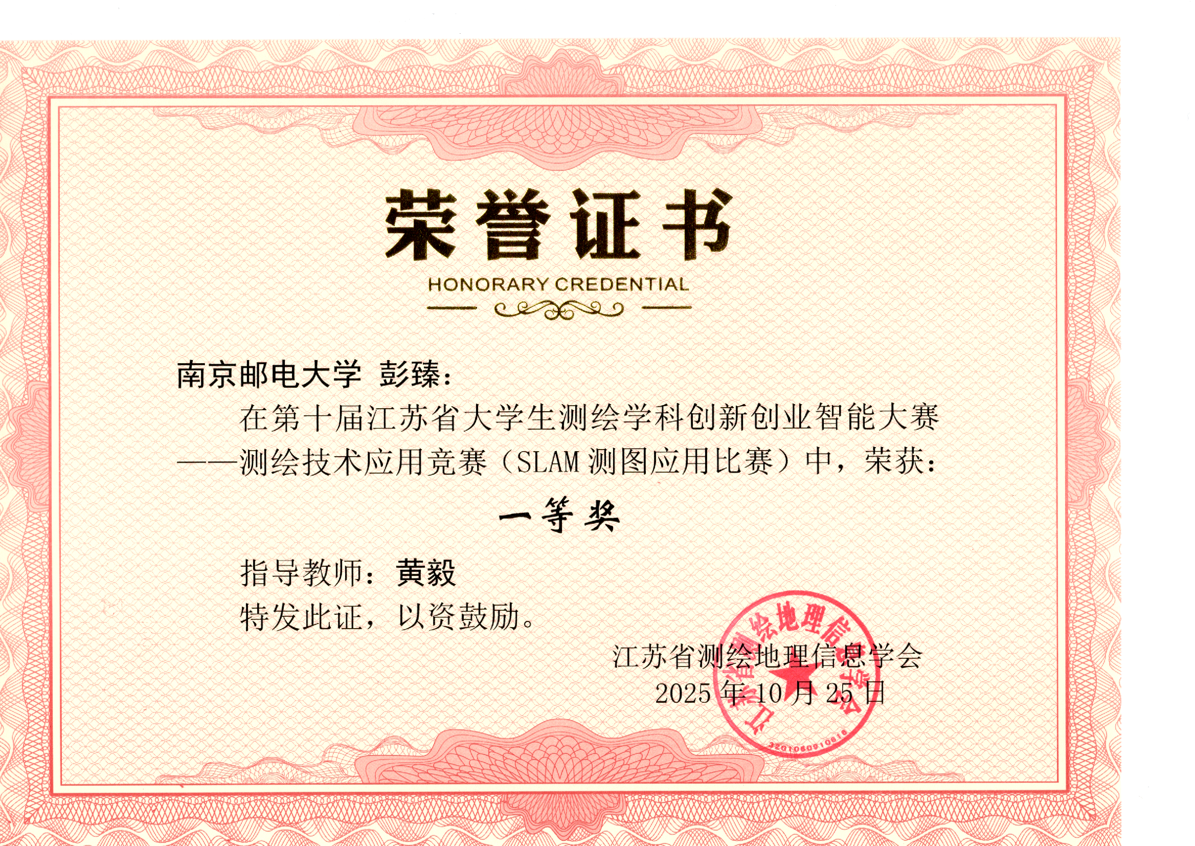 测绘技术应用竞赛(SLAM测图应用比赛) | 彭臻 | 黄毅 | 一等奖 |